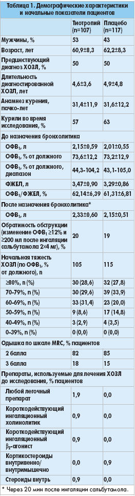 224 пациента рандомизировали для получения тиотропия (n=107) или плацебо (n=117). Исследование проводили с марта 2004 по июль 2005 года в 27 клинических центрах Швеции. Группы лечения были сравнимы по начальным значениям ОФВ1 (абсолютным и % от должного; табл. 1). Значимую обратимость обструкции (обратимость >12% и >200 мл) имели 20 и 19% пациентов в группах тиотрипия и плацебо соответственно. Все пациенты имели одышку по шкале MRC ≥2. Во всей популяции исследования I, II, III и IV стадии ХОЗЛ по определению GOLD имели соответственно 62 (28,2%), 151 (68,6%), 7 (3,2%) и 0 (0,0%) пациентов.