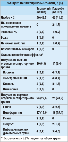 НС наблюдались с одинаковой частотой в обеих группах (табл. 2). Несмотря на то что у 2,8% пациентов группы тиотропия и у 0,9% группы плацебо были тяжелые НС, ни одно из них не было связано с лечением. В группе плацебо из-за НС прервали лечение два пациента (1,7%); среди получавших тиотропий таких случаев не было. Обострения ХОЗЛ развились у 2 пациентов (1,9%) на фоне лечения тиотропием и у 4 больных (3,4%) группы плацебо.