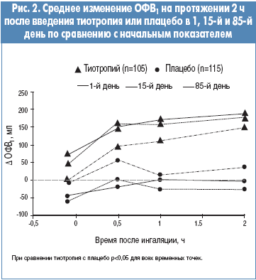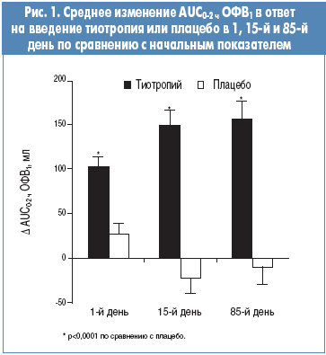 На 85-й день исследования AUC0-2 ч ОФВ1 (первичная конечная точка) в группе тиотропия улучшилась на 157±19 мл, в группе плацебо – ухудшилась на 9±18 мл по сравнению с начальным показателем (различие между группами 166±26 мл; р<0,0001; рис. 1). Значительное увеличение AUC0-2 ч ОФВ1 как ответ на препарат в группе тиотропия по сравнению с плацебо также наблюдалось в 1-й день (на 74±15 мл; р<0,0001) и 15-й день (на 172±22 мл, р<0,0001; рис. 1).