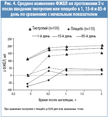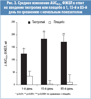 Для ФЖЕЛ получены примерно такие же результаты, как и для ОФВ1. Так, по сравнению с больными, получавшими плацебо, у пациентов группы тиотропия значительно улучшился показатель AUC0-2 ч ФЖЕЛ в 1-й день (на 89±27 мл, p<0,01), 15-й день (на 182±37 мл, p<0,0001) и 85-й день исследования (на 160±43 мл, p<0,001). Эти данные представлены на рисунке 3.
